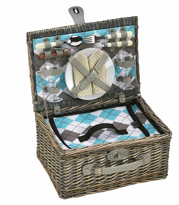 Picknickkorb Stresa, für 2 Personen, Olivgrüne Vollweide, mit Innenfutter, Scharniere, alle Riemen innen und außen aus Kunstleder, großes Kühlfach, inkl. 2 Messer, 2 Gabeln, 2 Löffel, 2 Gläser, 2 Teller weiße Keramik 2 Stoffservietten, 1 Kellner-Korkenzieher