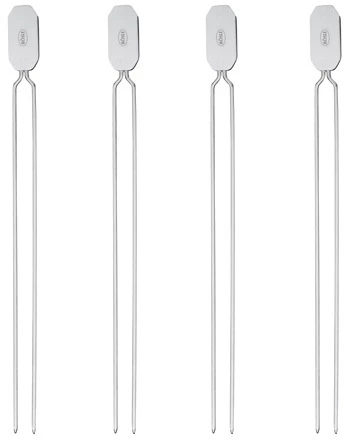 Set bestehend aus vier Edelstahlspießen. Doppelspieße verhindern, dass sich das Grillgut beim Wenden verdreht. Das große Griffelement kann auch mit Grillhandschuhen bequem angefasst werden. Extra lange Ausführung, Gesamtlänge 33 cm.